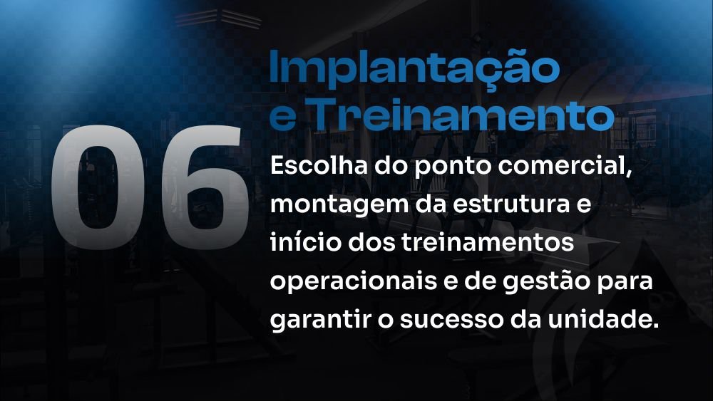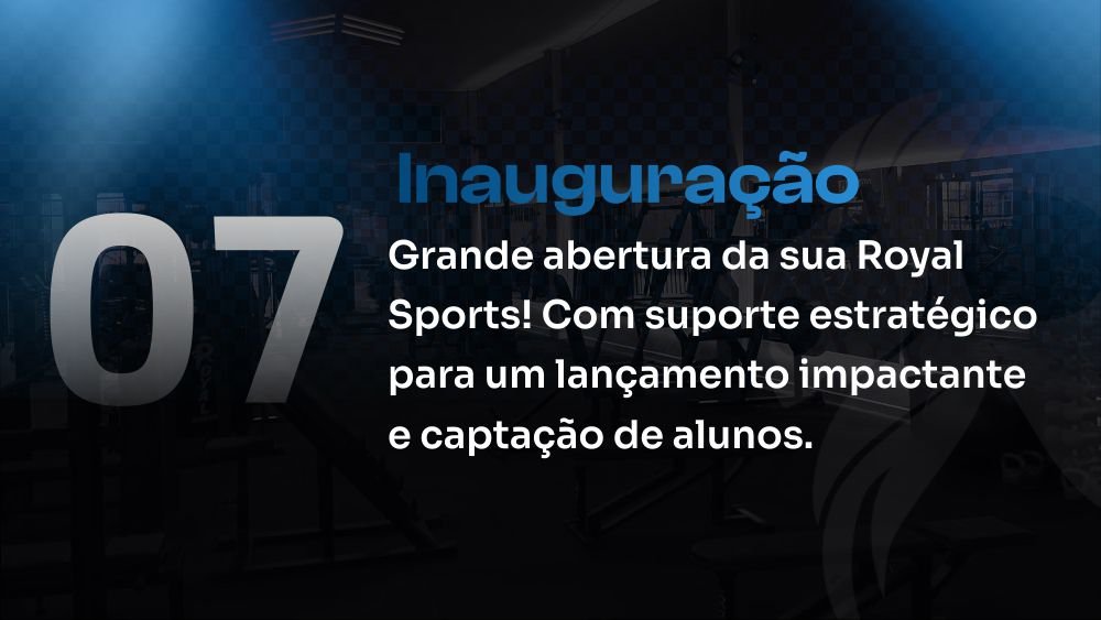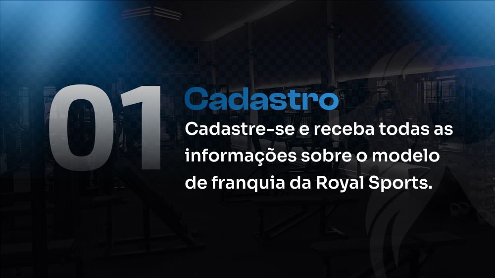 A Royal Sports é uma rede de academias que se destaca por oferecer mais que academias, uma experiência, combinando estrutura moderna, atendimento diferenciado e ambiente motivador. O modelo de franquia foi desenvolvido para empreendedores que desejam investir no mercado fitness com suporte completo e alto potencial de retorno.